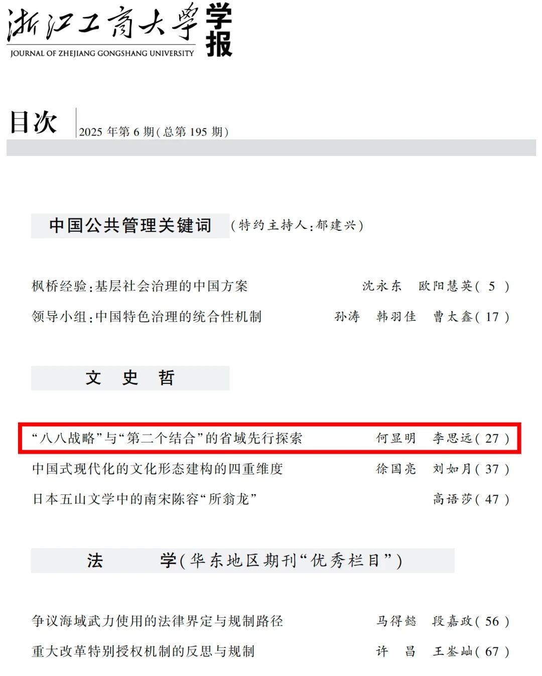 近日,浙江工商大学马克思主义学院教授何显明、博士研究生李思远在《浙江工商大学学报》发表文章《“八八战略” 与 “第二个结合” 的省域先行探索》,原文刊登于《浙江工商大学学报》2025年第6期。