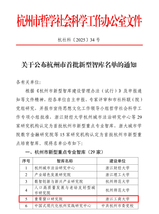 2025年12月8日,杭州市哲学社会科学工作办公室公布了杭州市首批新型智库名单,浙江工商大学重要窗口研究院经评审遴选认定入选杭州市新型重点专业智库。此次入选,是对研究院在服务杭州市委市政府科学决策、推动新型智库体系建设和深化理论创新研究方面的认可。