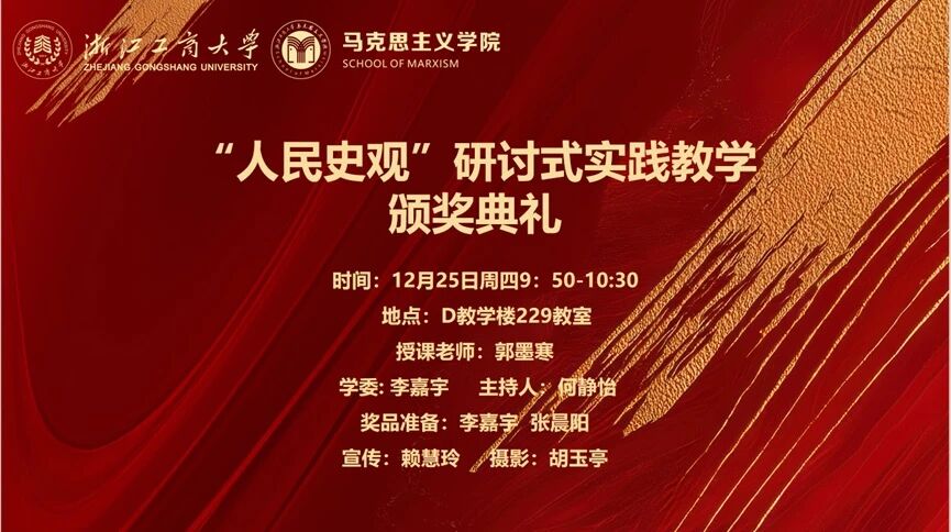 冬日暖阳沐初心,历史薪火永相传。12月18日,D教学楼229教室暖意融融、喜气洋洋,同学们怀着无比激动的心情,共同迎来 “人民史观” 研讨式实践教学《中国近现代史纲要》课程分享颁奖典礼的荣耀时刻!在这段探索历史、感悟初心的旅程中,各小组以时代为纸、以精神为墨,深挖历史长河里的璀璨星光,用扎实的研究成果,让 “人民创造历史” 的真理变得鲜活可感。