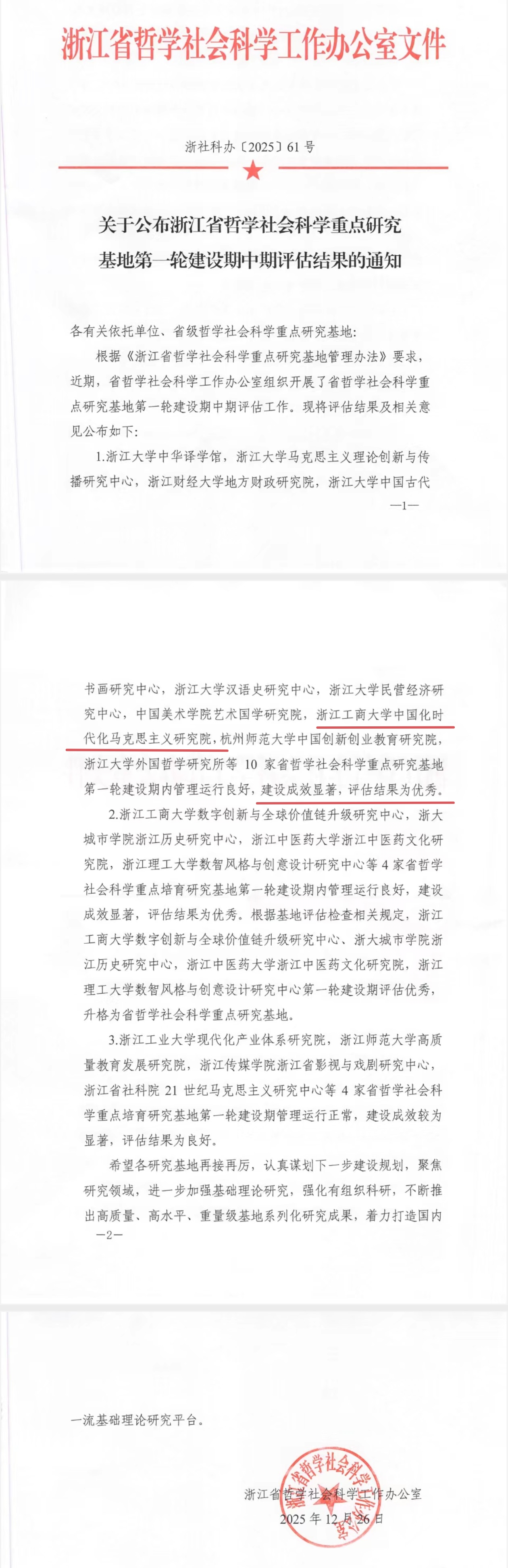 近日,浙江省哲学社会科学工作办公室公布了浙江省哲学社会科学重点研究基地第一轮建设期中期评估的结果。浙江工商大学中国化时代化马克思主义研究院在第一轮建设期内,建设成效显著,评估结果为优秀。