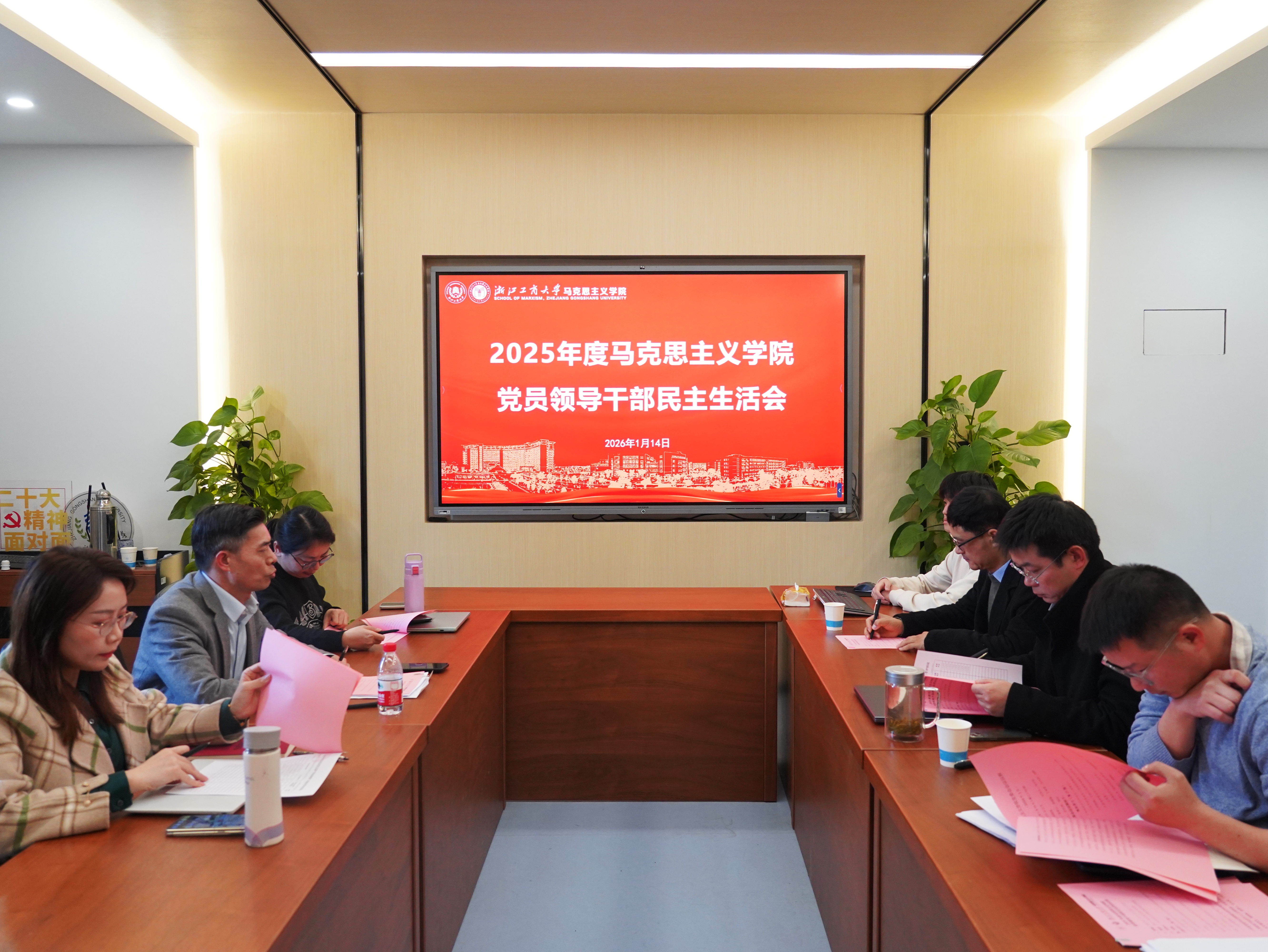2026年1月14日,浙江工商大学马克思主义学院党委在E栋418会议室召开2025年度党员领导干部民主生活会。学院党委领导班子全体成员参会,会议由学院党委书记郑群雄主持。会议紧扣主题、严肃认真,通过深化理论学习、深刻对照检查、严肃批评帮助,进一步统一思想、凝聚共识,为学院高质量发展夯实政治根基。
